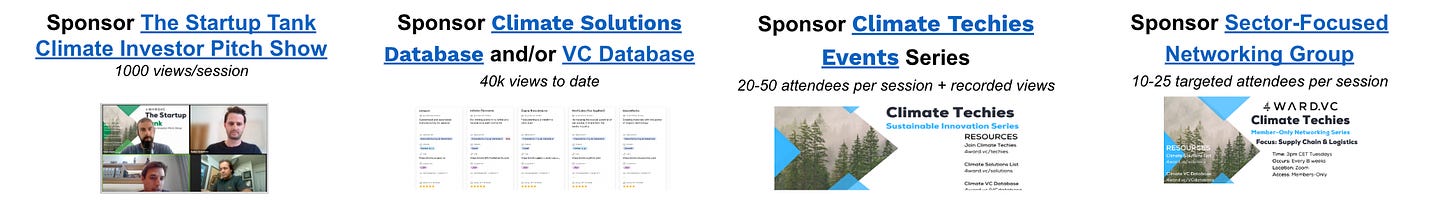 If so, becoming a strategic sponsorship partner with 4WARD.VC and Climate Techies could quite synergistic and value-add for you and your company to access our massive community of 14k+ engaged Climate Techies.